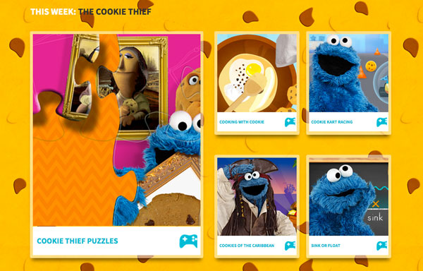 Right now on PBS Kids, find several video clips from The Cookie Thief. And over at Sesame Street find a whole bunch of related games including Cooking With Cookie and Cookie Thief Puzzle. There’s even one Pac-Man-inspired game that will be most fun for parents.