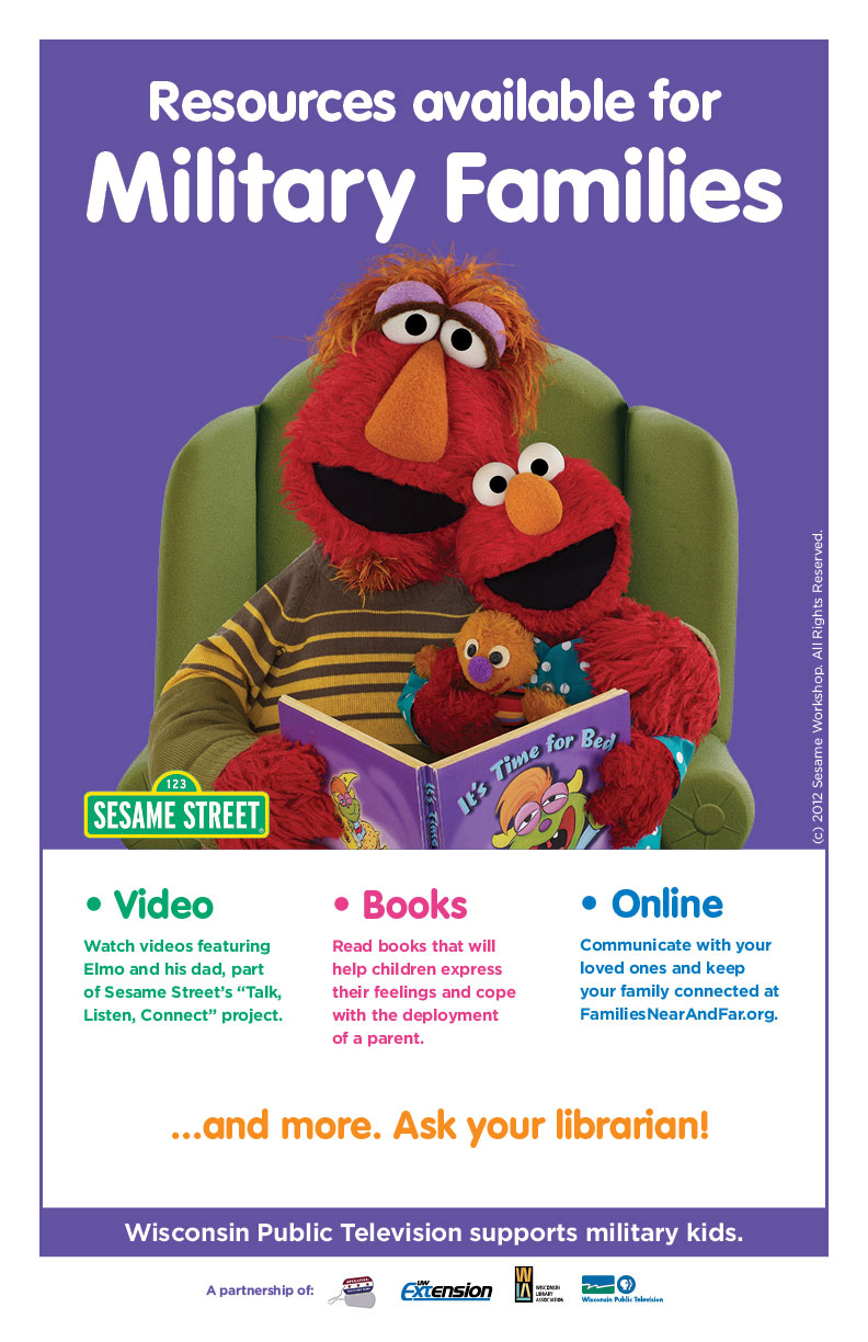 - Talk, Listen, Connect – A bilingual multimedia project from Sesame Workshop to help military families cope from pre-deployment to homecoming and through the physical or emotional injuries that can change a family post-deployment.